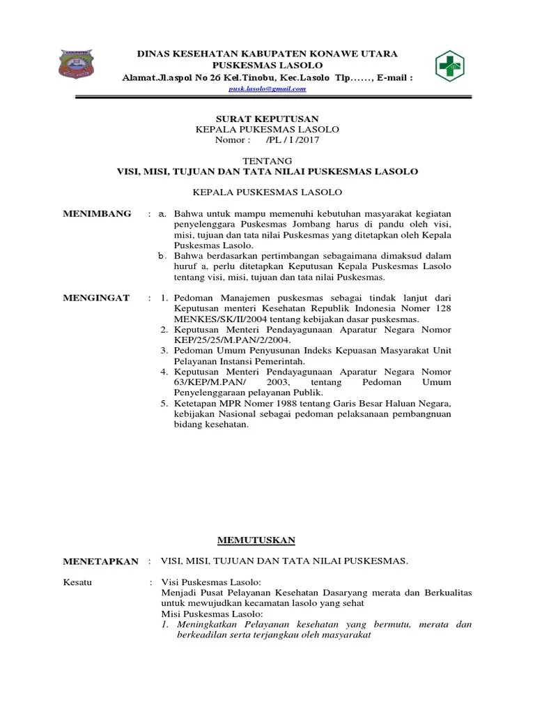 Pertama berdasarkan surat keputusan (sk) kepala puskesmas tentang jenis pelayanan dan visi, misi, tujuan, dan tata nilai puskesmas. July 28, 2017 | author: Komplek perkantoran pemda way kanan km 02 blambangan umpu, kabupaten way kanan, . 2.3.6 ep 1 sk visi misi tujuan dan tata nilai puskesmas.doc. Leave a reply cancel reply.